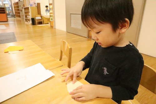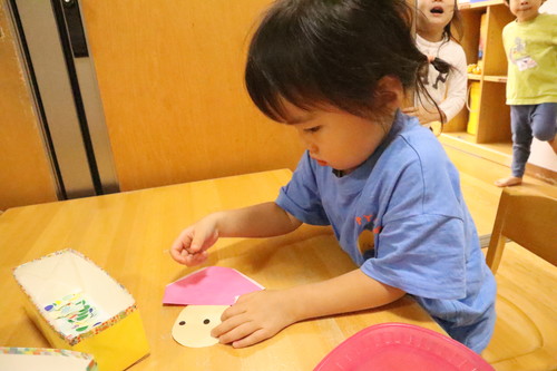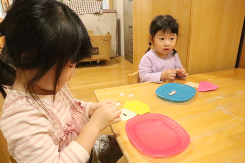 初めての折り紙で〝きのこ″を折るのに挑戦しました。きのこの写真や絵本を見て「きのこつくる?」「きのこすき!」と言って嬉しそうにつくっていましたよ!!折る場所が難しい部分は、お友だちや先生と一緒に確認をしながら折っていました。一人ひとりの個性のあるきのこを作ることができ、飾る日を楽しみにしている子どもたちです♪