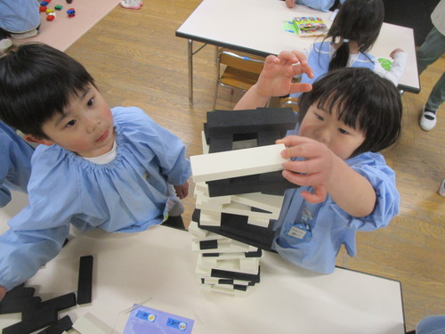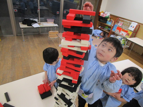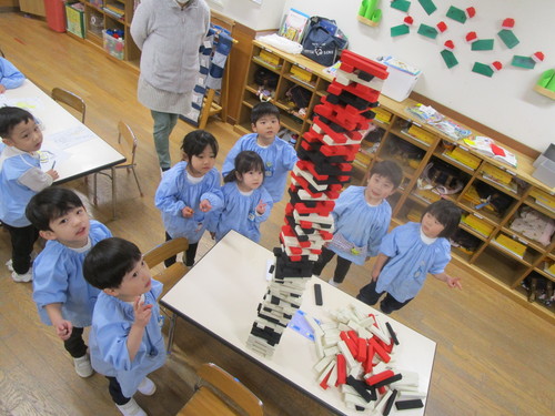 ブロックで遊んだよ♪(年少) 2026年1月15日(木) やわらかい素材で出来ているブロックを使って、みんなでタワーづくり!以前、年長さんがやっていたのを真似して積み方を工夫しながら、自分たちより遥かに高いタワーを完成させて、大喜びの子どもたちでした♪