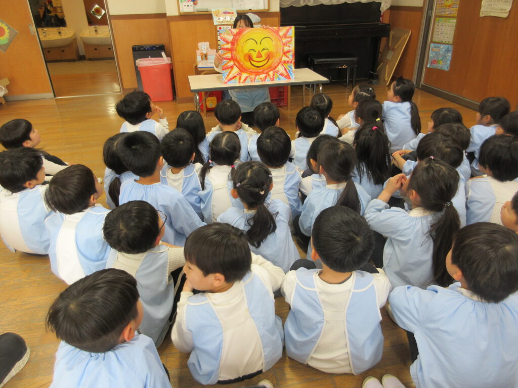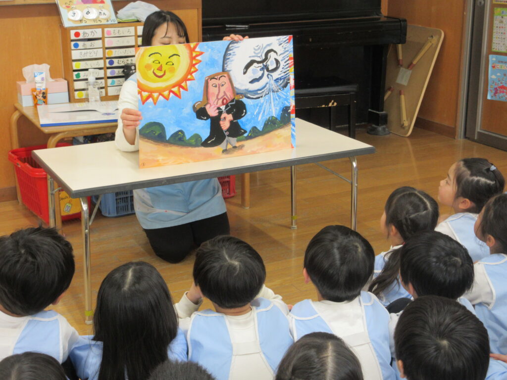 園に寄贈していただいた「きたかぜとたいよう」の大型紙芝居をみんなで読みました!